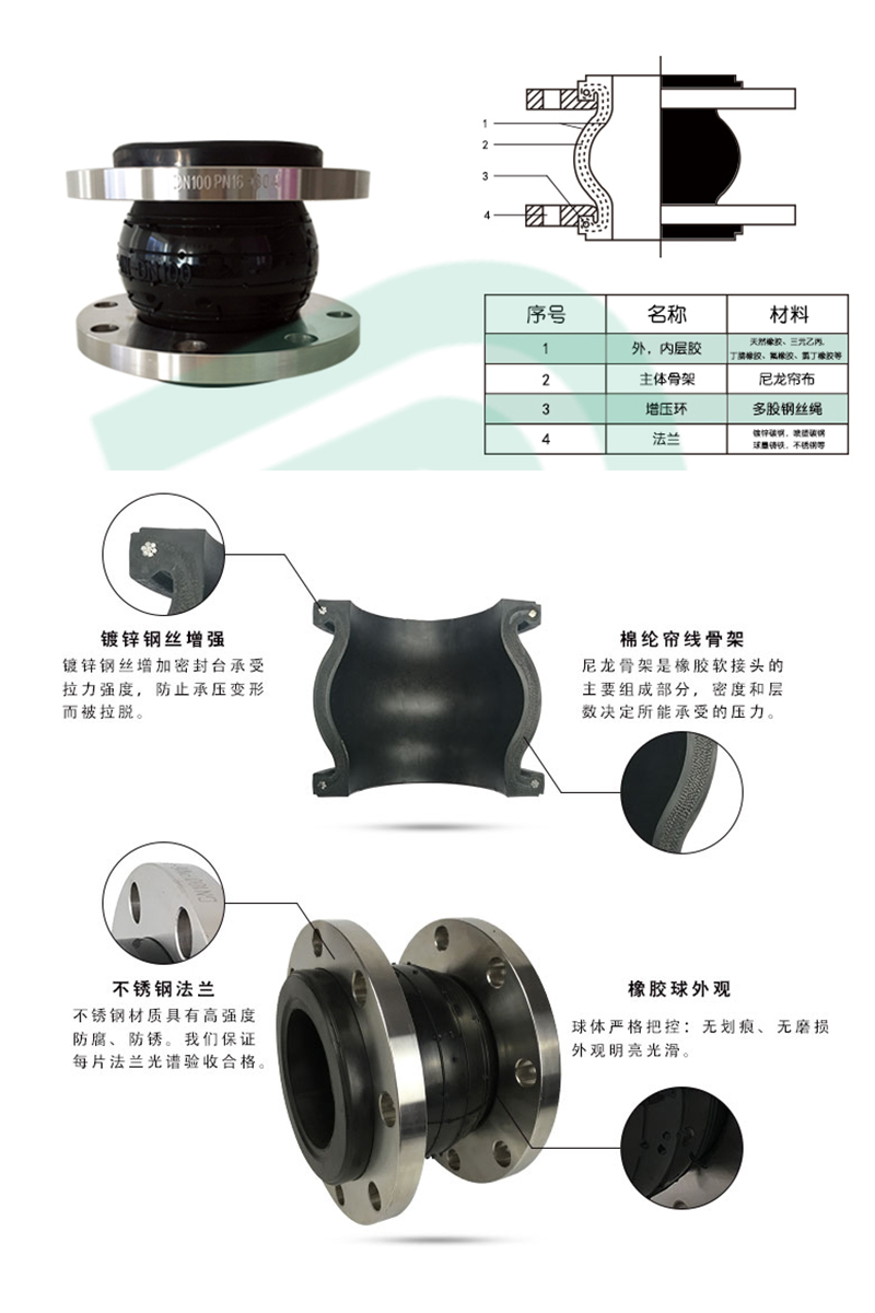 橡膠軟接頭一般由內(nèi)膠層、織物增強(qiáng)層(簾子布)、中膠層、外膠層、端部加固金屬環(huán)或鋼絲圈,經(jīng)高溫、高壓硫化成型后,與金屬法蘭或平行接頭松套組合而成的復(fù)合橡膠管,其使用壽命取決于簾子布的質(zhì)量。